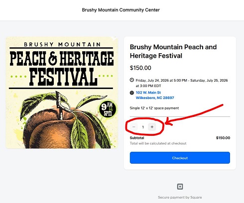 The payment page will automatically show a quantity of one (1), which equals one 12'x12' vendor space.